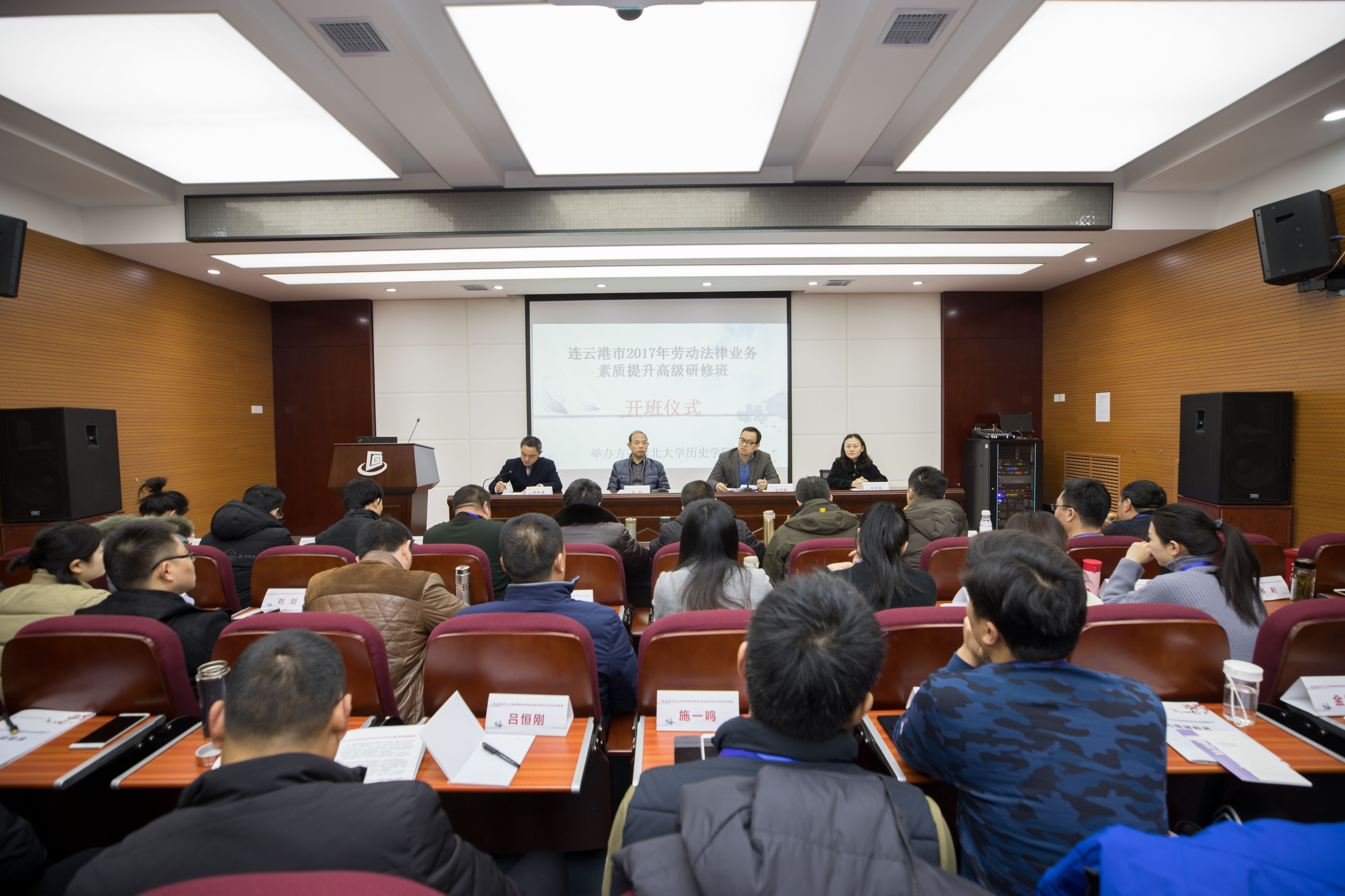 1218日上午,由连云港市人社局与我校776net必赢官网共同举办的“连云港市2017年劳动法律业务素质提升”高级研修班在我校太白校区开班。与会人员由连云港市人力资源和社会保障局、劳动人事争议仲裁院和监察大队以及我校776net必赢官网负责人构成,江苏连云港市社局和下辖各级政府单位的30余名参训领导干部参加开班仪式。