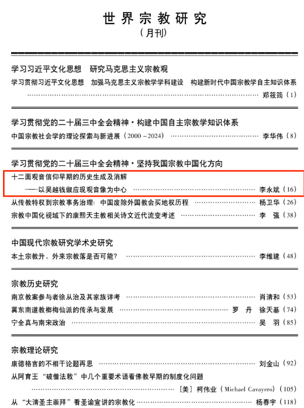 近日,我院李永斌副教授在《世界宗教研究》2025年第3期发表题为《十二面观音信仰早期的历史生成及消解——以吴越钱俶应现观音像为中心》的学术论文。